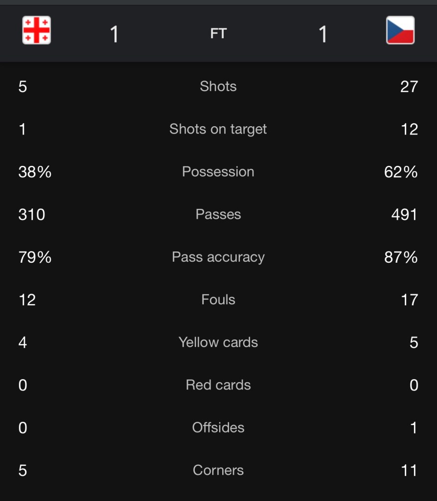 CZECH OVERLOADING THE BOX TRYING TO FASHION A WIN OUT BUT COULD HAVE HURT THEM IN THE END AS THEY LEFT THEMSELF OPEN TO CONCEDE A LATE COUNTER ATTACK. GEORGIA TRYING TO PUT INDIVIDUAL QUALITY AND BRILLIANCE IN PLACE TO ATTRACT A WIN. GEORGIA PLAYING TRANSITION FOOTBALL, TRYING TO HIT ON COUNTER WHICH WORKS FOR THEM PERFECTLY. A DRAW IS DEFINITELY THE BEST OUTCOME OF THE MATCH. GEORGIA DEFEND REAL HARD, EVERY INDIVIDUAL ARE UP FOR THE FIGHT AND DEFEND HARDER. GEORGIA SHOULD BE PROUD OF HOW THEY HAVE PLAYED, MANY SEE THEM AS A CANDLE LIGHT IN THIS TOURNAMENT THAT EVERY TEAM WILL BLOW OFF EASILY BUT TURN OUT TO BE A ROCK SOLID TEAM. AS BOTH TEAM LOOK LIKE THEY WILL BE HEADING OUT OF THE TOURNAMENT.