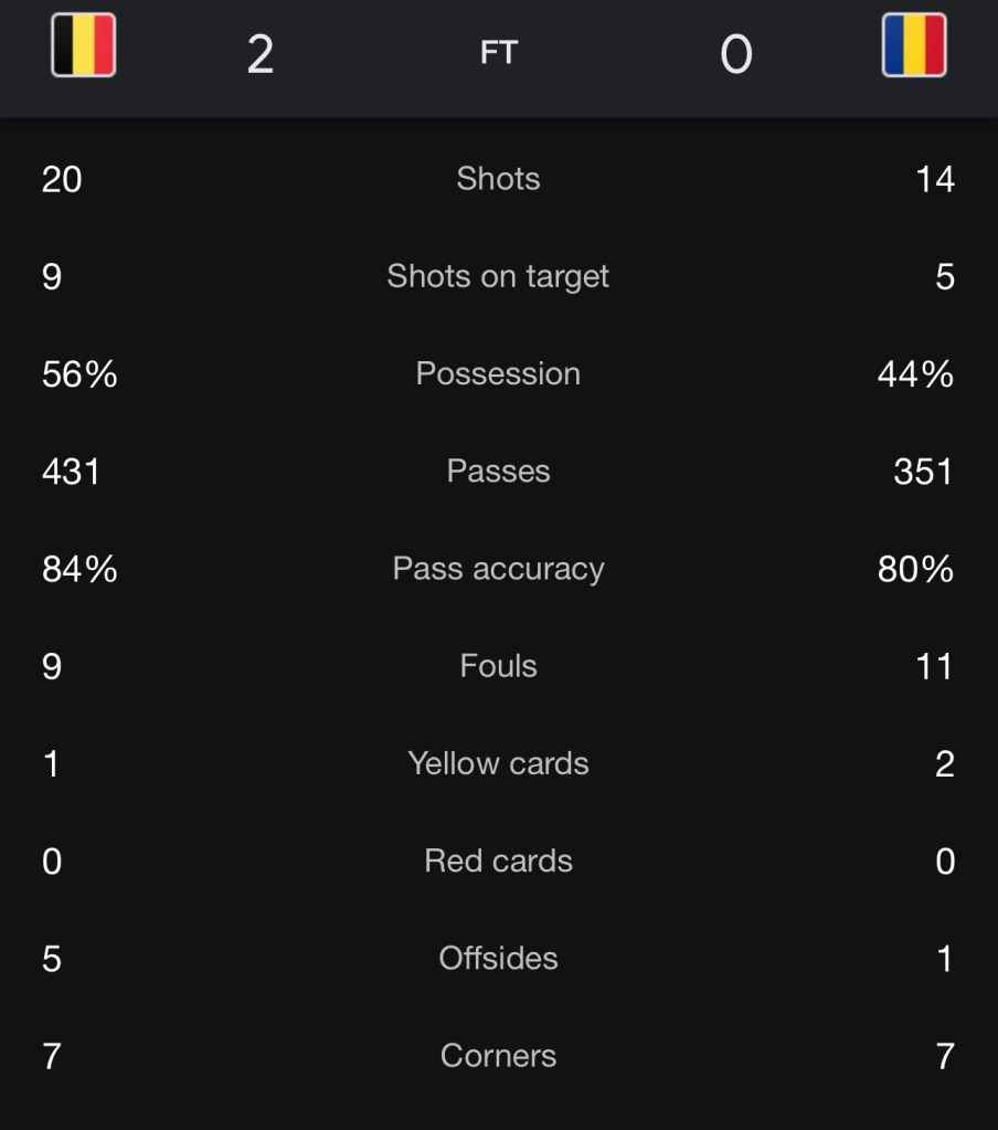 INTERESTING MATCHUP BETWEEN THE TWO TEAMS. BREAKING FROM DEFENSE STRAIGHT TO ATTACK. ROMANIA VERY PHYSICAL, PRESSING VERY HIGH UP AND DOWN THE FIELD. GOOD TEAM SPIRIT WITH HIGH AGILITY. ROMANIA NOT SHY AWAY FROM PLAYING SOME GOOD FOOTBALL. WHAT A TEAM THEY HAVE BEEN SO FAR. BELGIUM A VERY ATTACKING AND DEFENSIVE TEAM. WHAT A GREAT GAME TO WATCH. BELGIUM RAN THE SHOW ALL THROUGH WITH THE DIFFERENCE TO BE THE QUALITY OF THE TEAM AND THEY RAN AWAY WITH THE POINT IN THE BAG. EVEN THOUGH ROMANIA LOST THE GAME THEY HAVE TO BE VERY PROUD OF THEIR PERFORMANCE SO FAR, NEVER SHY AWAY FROM PLAYING AND WITH ONE MORE GAME TO GO THEY WILL HAVE EVERYTHING TO PROVE. THIS GROUP IS A GROUP TO WATCH OUT FOR IN THE LAST GAME.
